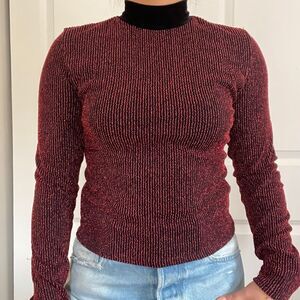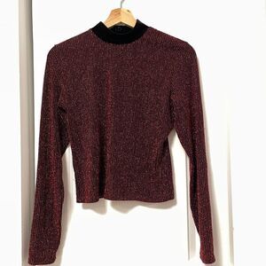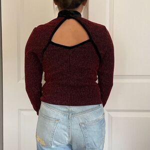 Description: perfect for the holidays sparkly mockneck top, velvet neckline, open upper back with snap button, super stretchy material, red sparkly material over black cloth, made in the USA
