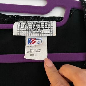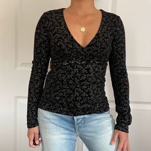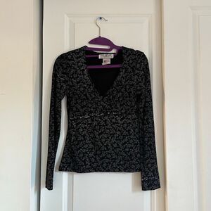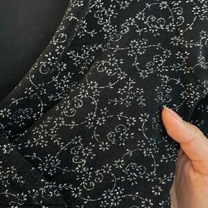 Descriptions: black top with silver glitter flower print, overlapping v neckline, stretchy material, very flattering, made in the USA