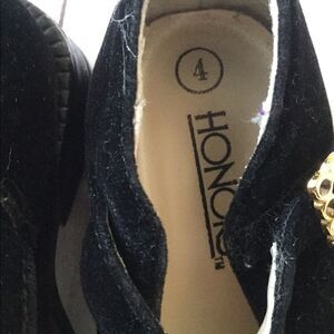 Size 4 ,runs small, so listing at 3.5, suede shoes with Jeweled. Heckle Velcro closure. I think a stone is missing