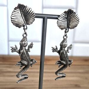 A textured pendant of a #lizard or gecko hangs from the #leaf. The reptile is highly detailed, featuring a bumpy skin texture and splayed limbs, creating a dynamic, leaping effect.
