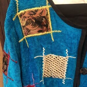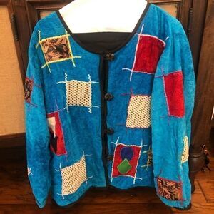 Blue with multiple patches throughout. Very unique addition to your wardrobe