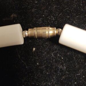 White Beaded necklace. Twist clasp Beautiful bright white Beads alternate between smooth gold rings. Super fun clip vintage matching earrings.
