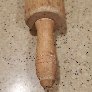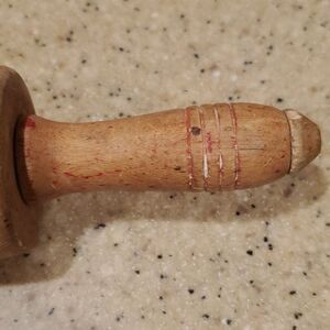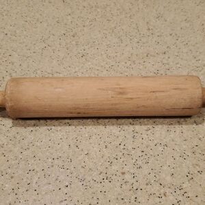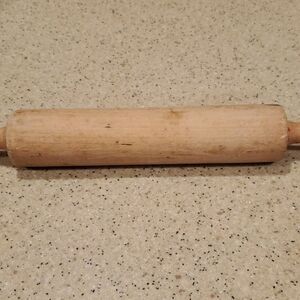 This is a vintage wooden rolling pin. The red on handles is long gone and there is just a faint reminder of it. This rolling pin measures about 17" on length and 2" in diameter.