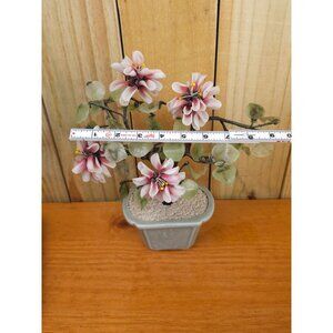 This item is a vintage Chinese art glass bonsai tree featuring pink flowers and jade-style green leaves in a celadon-colored ceramic pot. These pieces were popular mid-century decor items, and the leaves and flowers are often made from carved semi-precious stones or glass held together by wire, allowing the branches to be posed. The leaves are jade-style glass, and the pink flowers are made of glass or pink quartz/agate stone. The branches are formed with wrapped wire, and the trunk is a solid material, all set in a ceramic pot filled with small pebbles. These are generally Chinese in origin and are often identified as vintage or mid-century pieces (circa 1960s-1970s). Measures approximately 11 inches tall. Excellent vintage condition. Please see pictures for details.