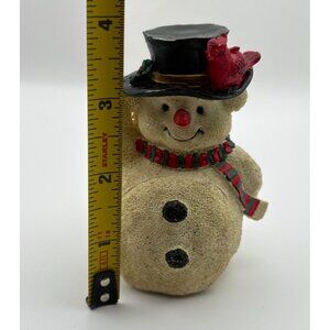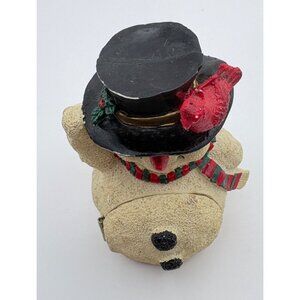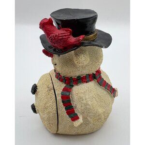 This charming snowman figurine features a hinged box design, revealing a delightful Christmas scene inside. The snowman is adorned with a cardinal on its hat, adding a festive touch. Made from durable resin, this piece is a unique addition to holiday decor collections.