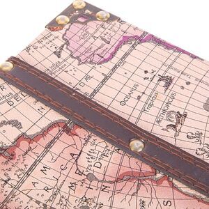 Stylish suitcase with a vintage map design. Features leather straps and brass accents. Perfect for travel or decor.