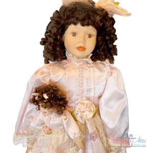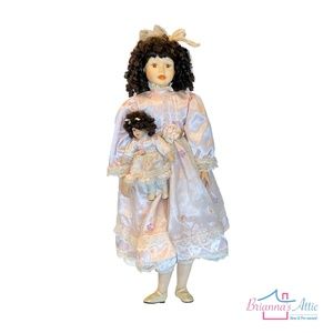 Vintage porcelain doll that will transport you to a bygone era of elegance and charm. Standing at an impressive height of 31 inches, this exquisite doll is adorned in a delicate pink dress, adorned with intricate lacework that adds a touch of sophistication. What makes this doll truly unique is the precious baby doll attached to the main doll in the front, creating an endearing and heartwarming sight. With meticulous craftsmanship and attention to detail, this vintage porcelain doll is a true collector's treasure. Add a touch of nostalgia and beauty to your collection or home decor with this enchanting piece that captures the essence of timeless beauty