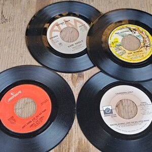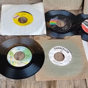 Black 45 RPM vinyl records in paper sleeves. Classic analog audio for turntables and collectors. Easy to play and great for enthusiasts seeking vintage sound. Includes assorted sleeve colors and labels.