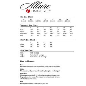 Soft touch vinyl and brocade bra with elastic neck and back. Matching G-string with elastic back. Two piece set. Black/Pink. This is a genuine Allure Lingerie Inc item. New in package. Coating- Outer Layer: Polyurethane Middle Layer: Polyvinyl Chloride Knit: 100% Polyester. One size fits most, see size chart under O/S in pictures.