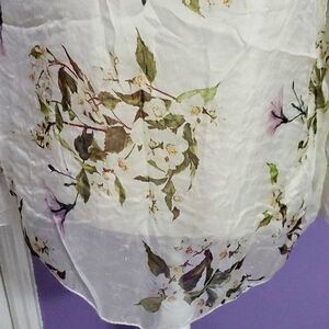 Cream floral long sleeve overlaid top. Boat neckline. Boho style flare sleeve bottom hem. Flowy construction with a high low hem. Cream camisole underneath. Shell is 100% silk; lining is 95% viscose and 5% elastane.
