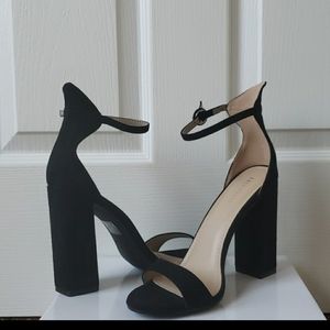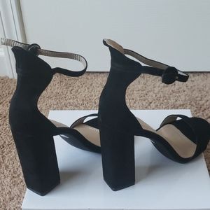NWT! Screaming sexy and stylish, this black faux suede, open- toe, block heel can easily transition from workday to evening galas to playtime! Never worn! 4.5" heel. Size 10.