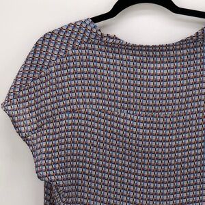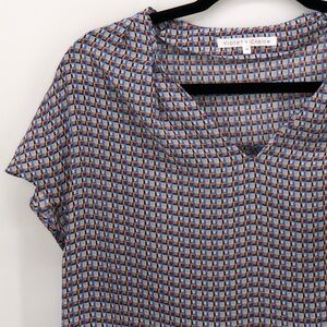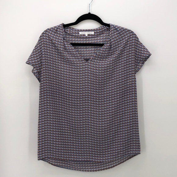 Short sleeved with a v notched neck blouse/shirt from Violet and Claire. Geometric design that's almost plaid in blues and pinks. Size Medium. Used condition--please see photos. Measurements are approximate and Taken When Garment Laid Flat. Armpit to Armpit: 21" Length:25".