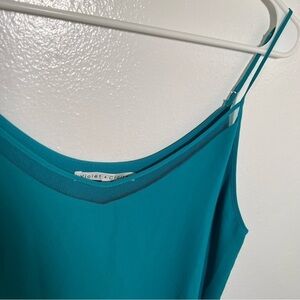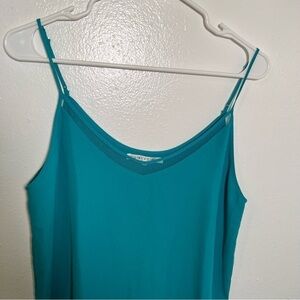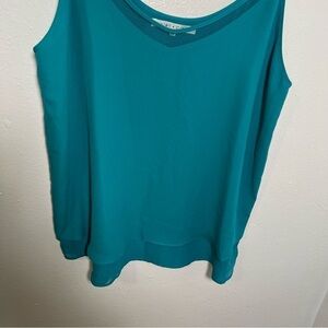 Great condition, minor wear on straps as shown. Violet + Claire. Sleeveless blouse. V-neck. Mesh detail at neckline. Tiered hem. Blue green color (more blue than pictures show). Adjustable straps. Size medium. 100% polyester. Pit to pit laying flat 18” shoulder to hem 25”. All measurements are approximate and taken lying flat. Smoke free home. No trades, offers welcome.