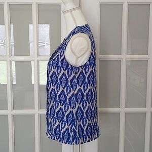 Button front sleeveless blouse with hidden button placket and all over ikat print.