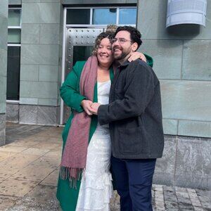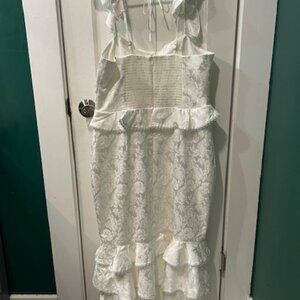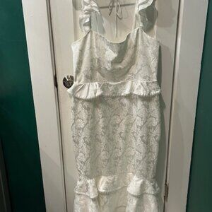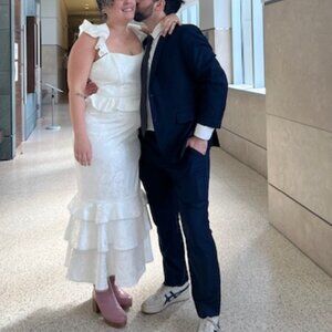 Like new Violet Dress by V. Chapman - worn only once for my courthouse wedding and has been professionally cleaned. It is a fitted, ankle length dress with ruffles and a floral fabric. I LOVE this dress but have no reason to wear it again. Would be lovely for engagement photos, rehearsal dinner, or even as a second reception dress!