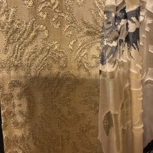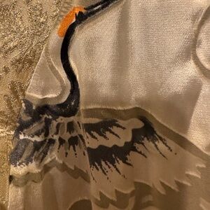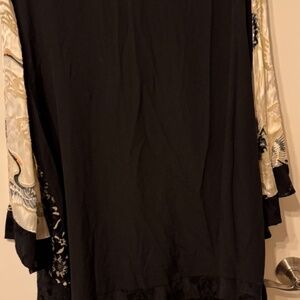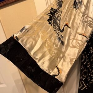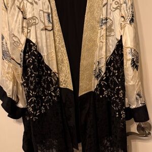 Gorgeous statement kimono jacket with serious art-gallery energy. The front panels mix pearly crane-print satin, gold brocade jacquard, and black floral lace with a soft black knit back. Open-front drape with a handkerchief hem that floats and moves beautifully when you walk. Sleeves are wide and slightly flared with contrast black cuffs for a dramatic, elegant finish.