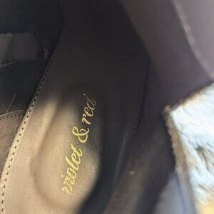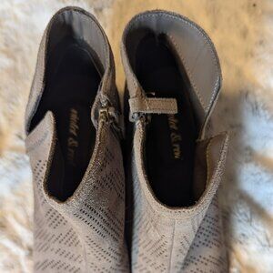 Violet & Red brand Jensen heeled bootie. Taupe. Size 10. Leather, with 2-1/2" heel. Gently used. Great for fall. Slightly pointed toe. Perforated appearance, but lined inside. Zipper on one side, with ankle cutout on opposite side. Smoke-free, low scent pet-friendly home.