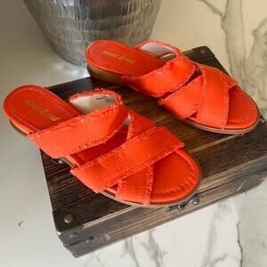 These NWOB Violet & Red Primm Silver Wedge Sandals feature wide frayed canvas straps, slip-on styling, and a vibrant fun color.