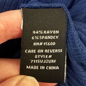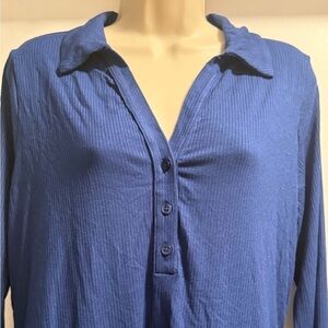 Violet & Roses deep blue ribbed bodysuit in plus size 1X. This long-sleeve bodysuit is made from a rayon-spandex blend and features a V-neck with a chic collar and a button closure.