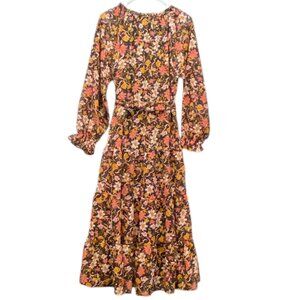 Vintage Long Raglan Sleeve Gypsy Ruffled Tiered Maxi Dress from Violet Skies. Lovingly worn – looks in excellent condition. Relaxed peasant silhouette in sheer gold and adobe on black botanical print. Scoop ruffle slit neckline with front ties. Low curved waistline with three tiers of gathered ruffles forming skirt. Bodice & body lined in solid black stretch knit. Lining ends just below start of bottom tier. Long sheer sleeves with elastic ruffle at wrist. Self fabric tie belt at true waist. Slip on styling. Hits just above ankles. Pairs beautifully with boots, sandals, or layered jewelry.