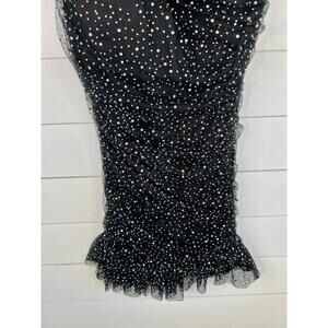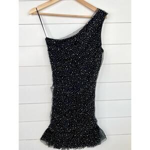 Violet Weekend Black Mini length Polka dot embellishments Ruffled hem Sheer overlay One-shoulder Dress 5/6