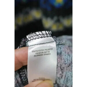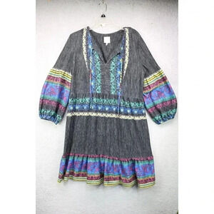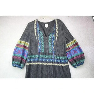 This is a Violet Weekend Long Balloon Sleeve Dress that is a size 16. It is dark gray with pretty colors in the designs. It has long big balloon sleeves that are nice. It is 85% Polyester, 10% Rayon, and 5% Spandex. Laying flat, it measures: Armpit to armpit-21" and the length is 36.5". In Great Condition.