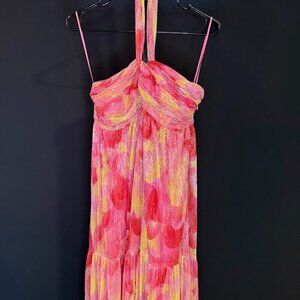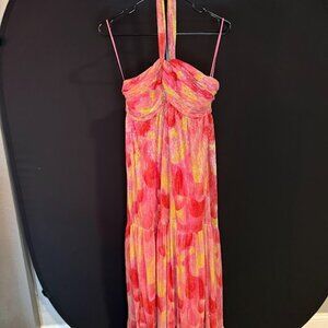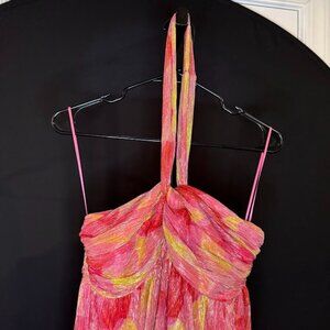 Junior's Violet Weekend metallic printed halter maxi dress. Sunset/pineapple color. Great condition. Retail: $129. Size 9/10. Pit to pit: 17". Total length from pit: 49".