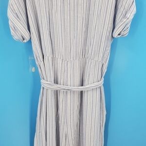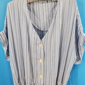Violet Weekend new without tags jumpsuit, blue and white stripes, elastic waist and cloth tie, very Coastal, short cuffed sleeves, size Medium measurements are listed in photos