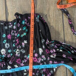 Very sheer and romantic top. The 3/4 length sleeves are split about halfway down. You can leave them like that, or use the ties to secure them at the ends, having only cutouts in the sleeves. This is hard to see in the pictures, I apologize. Deep v-neck, but able to secure with a tie, leaving a keyhole cutout and not as deep of a cut. There's also a functional cinching tie at the waist, so you can draw it in however is comfortable and most flattering. Scrunched fabric, and I do love the instructions ordering you to "do not iron." Shucks, right? So you could roll or wad this up and it would be the same! This would be cute over a cami with leggings, or even as a cover-up on the beach or at the lake. Excellent condition, and the pretty colors of teal and orchid look sharp on the black background.