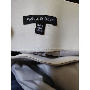 These Violets and Roses pants in size 6/28 feature a solid gray color with a woven fabric blend of spandex and cotton. The pants have an elastic waist for comfort and a pull-on closure, making them perfect for casual, workwear, or business occasions. With a straight leg style and flat front design, these pants offer a versatile and classic look that can be worn year-round in all seasons. The brand's city and preppy theme adds a stylish touch to these versatile chino-style pants.