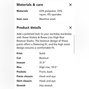 Violets & Roses Lisa High Rise Bootcut Slacks, Size 12. Never been worn, in perfect condition.