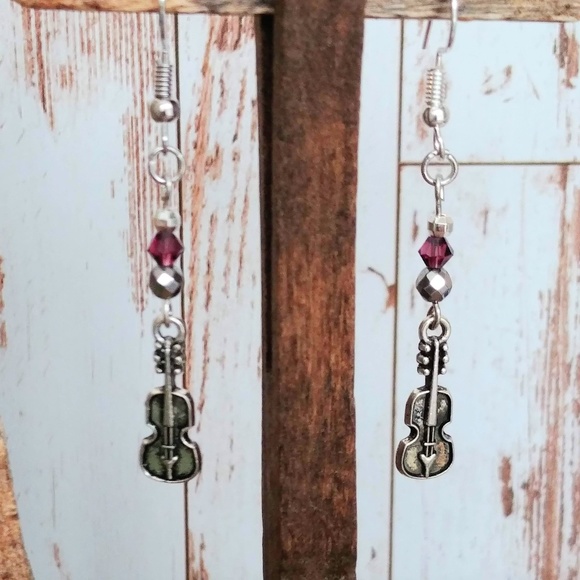 Silver tone violin charm combined with Czech glass and sterling silver beads. Stainless steel ear wires.