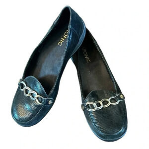 Vionic ALDA Black Snake Print Chain Leather Slip On Driving Loafers Size 6 1/2