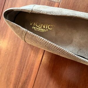 Stylish Vionic slip-on loafers with a textured beige upper crafted from genuine leather. Made with orthaheel technology for everyday comfort. In excellent condition, they look almost new!
