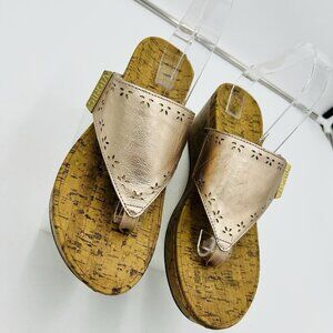 Vionic Anitra Sandals Women Size 9 Rose Gold Cork Wedge Thong Orthaheel. These wedges are in great condition. The only issue is the clasp on one shoe has separated slightly from the leather. This is on the underside of the shoe and does not show when worn, see pics.