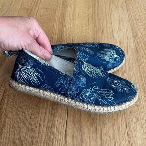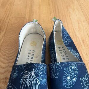 Vionic Beach Laguna Pismo Coral Blue Canvas Slip On Shoes- Women's Size 6. Blue/white beach ocean underwater print, lightweight canvas uppers. In good preowned condition.