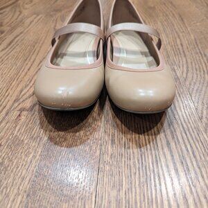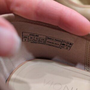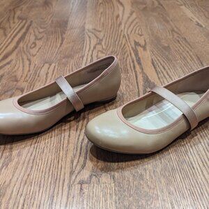 Stylish Vionic flats with a beige body and pink trim. Comfortable and chic design.