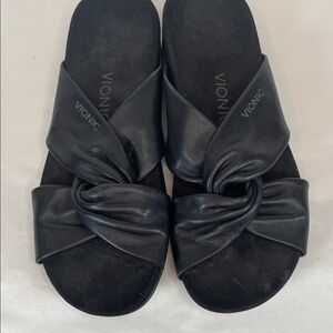 Vionic Black Leather Shelley Slide Sandal 9 wide crossover straps cushioned arch