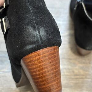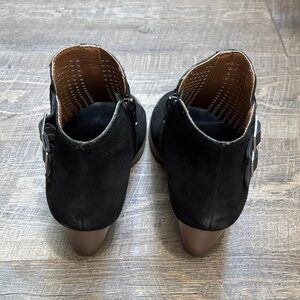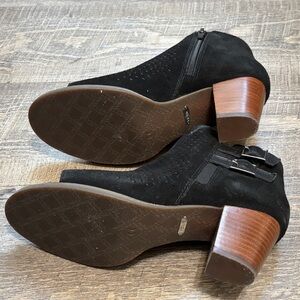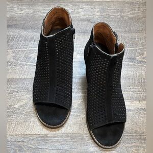Stylish black peep-toe booties with perforated design. Comfortable and versatile for any outfit.