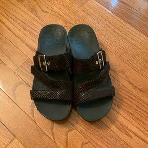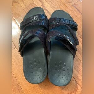 Stylish Vionic sandals. Black straps with buckle detail. Comfortable footbed. Enjoyed these sandals but ready to try something different.