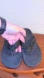 Stylish black flip flops featuring textured sequin straps. Perfect for casual wear or to dress up. These are an orthopedic sandal they do not have much wear on the soul inside. Might need to be cleaned. A little bit item comes from a smoke free home.