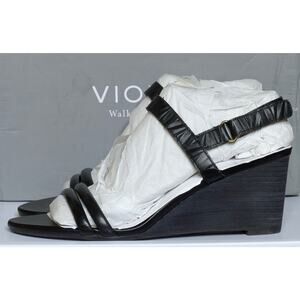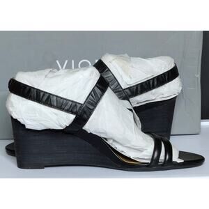 Elegant black sandals with wedge heel. Features strappy design and comfortable fit.