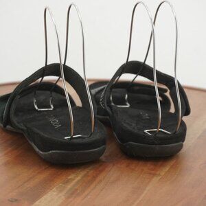 Stylish black sandals with textured straps. Comfortable and chic design.