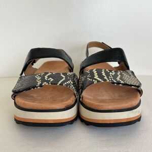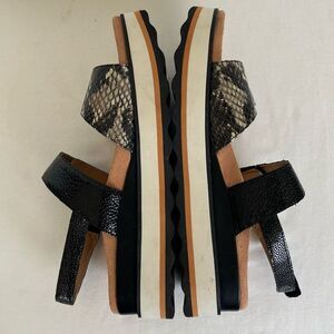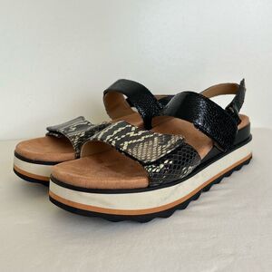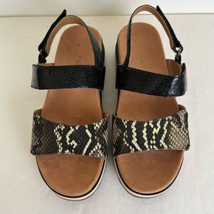 Elegant sandals with black straps and tan snake print. Comfortable footbed and stylish design.
