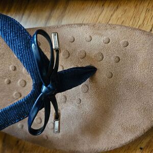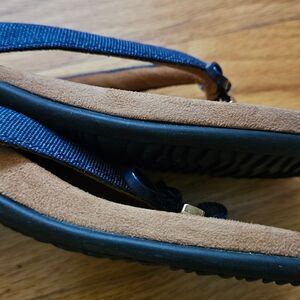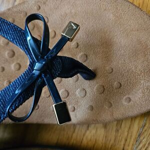 Experience the perfect blend of style and comfort with Vionic's denim blue and brown sandals. Featuring decorative bow accents on the straps, these sandals are designed for both elegance and support. The textured footbed ensures a comfortable fit for all-day wear.
