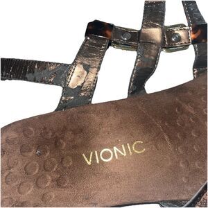 This is a pair of Vionic Amber brown tortoise shell strappy sandals in a women's size 8.