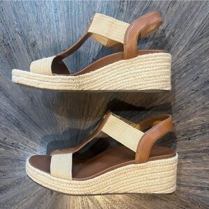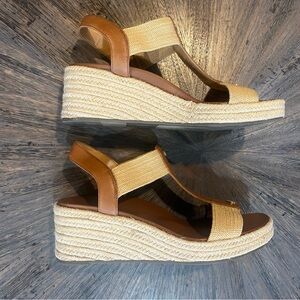 Stylish Vionic Calera espadrille sandals. Brown leather with tan fabric accents. Comfortable and chic design. Excellent used condition
