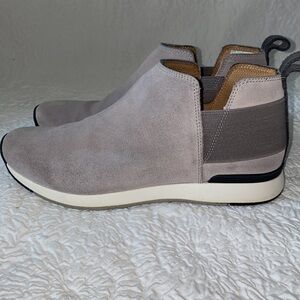 - Suede or leather upper, dual gore panels, and a sporty band wrapped around the ankle.
