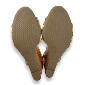 Vionic Clarita Size 10 Orthotic Strappy Brown Leather Woven T-Strap Wedge Sandal