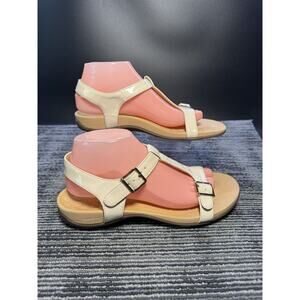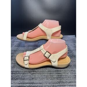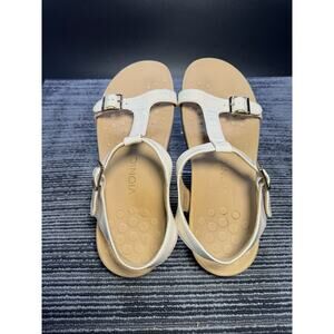Elegant Vionic sandals with cream straps. Features buckle accents. Designed for comfort.